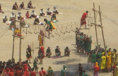 zwei balancieren von zwei Enden ueber die Haengebruecke