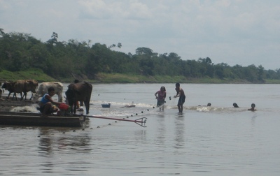 Kühe, Fischer, Badende