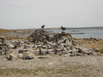zwei Scuas beobachten Pinguine und warten auf ihre Chance